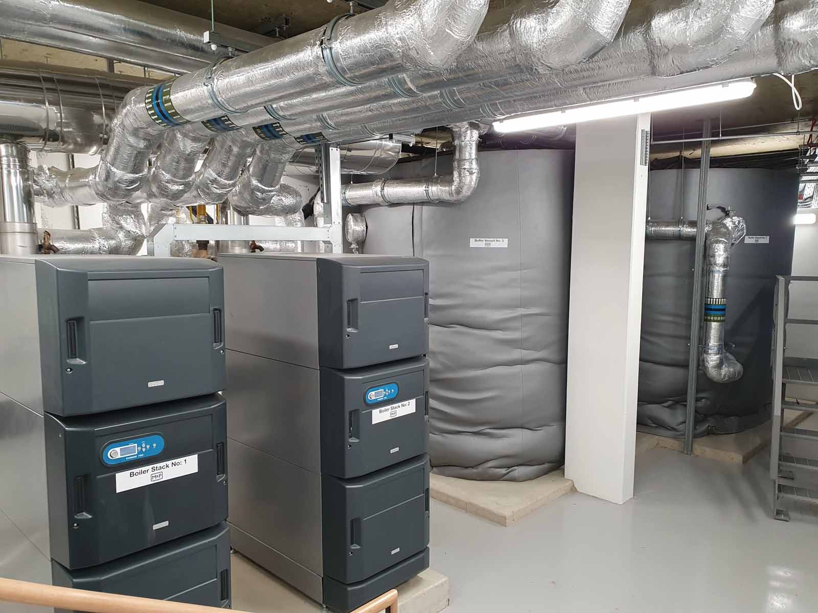 Heating system:Community heating system, featuring a Solid Energy AWB200 air-to-water heat pump (550 kW @ 2C) with 3 x 12,000 L buffer vessels, 2 x Ideal Evomod 750 kW gas boilers (for backup and peak loads), Grundfos pumps, Danfoss Termix VVX heat interface units (one per apartment), Calpex underground distribution pipes. Mixture of heater batteries on supply air and radiators/towel rails.