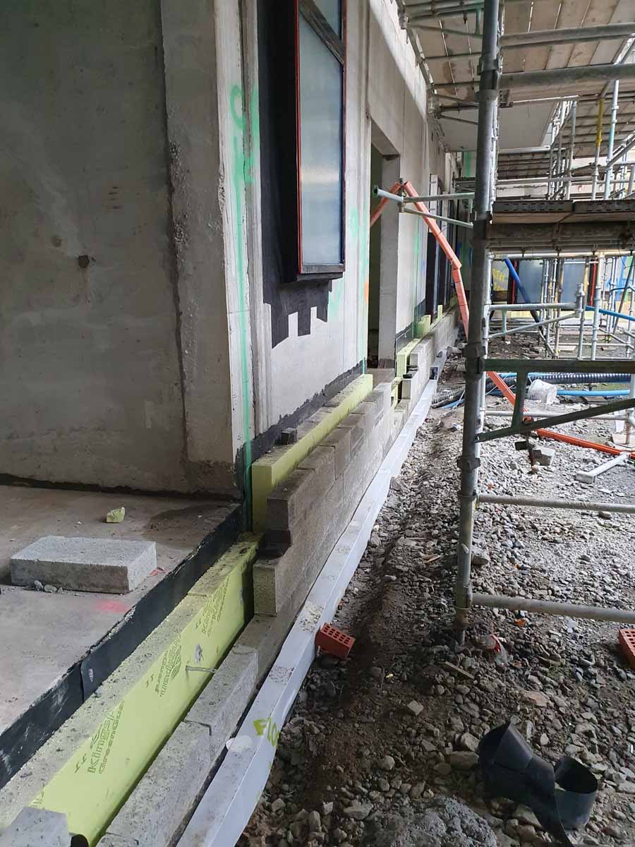 The build spec includes XPS insulation to prevent thermal bridging at ground beams beneath a 150 reinforced concrete floor slab, insulated with 100mm of Unilin XT/ UF PIR insulation