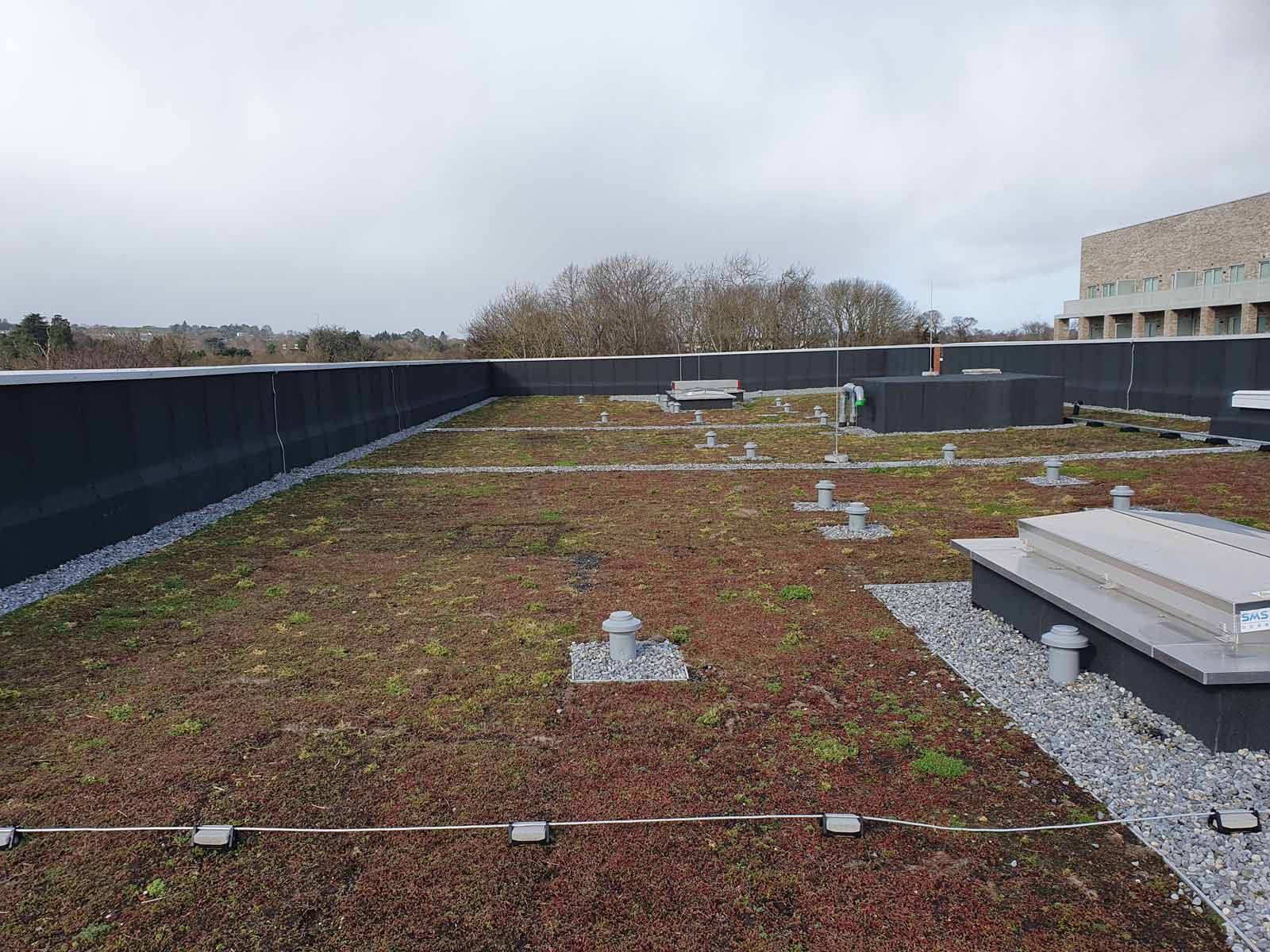 To prevent thermal bridging at the junction of where the external walls meet the roof, the parapet was highly insulated and finished, prior to the sedum layer being installed.