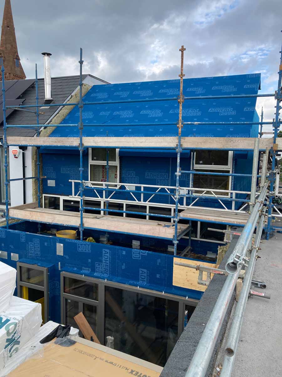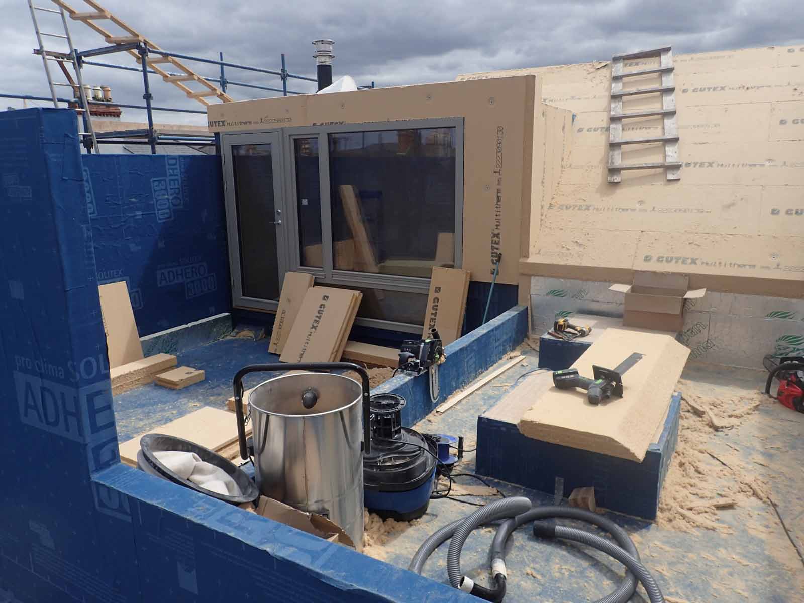 Rear terrace and roofs during installation of three-layer 240 mm wood-fibre insulation