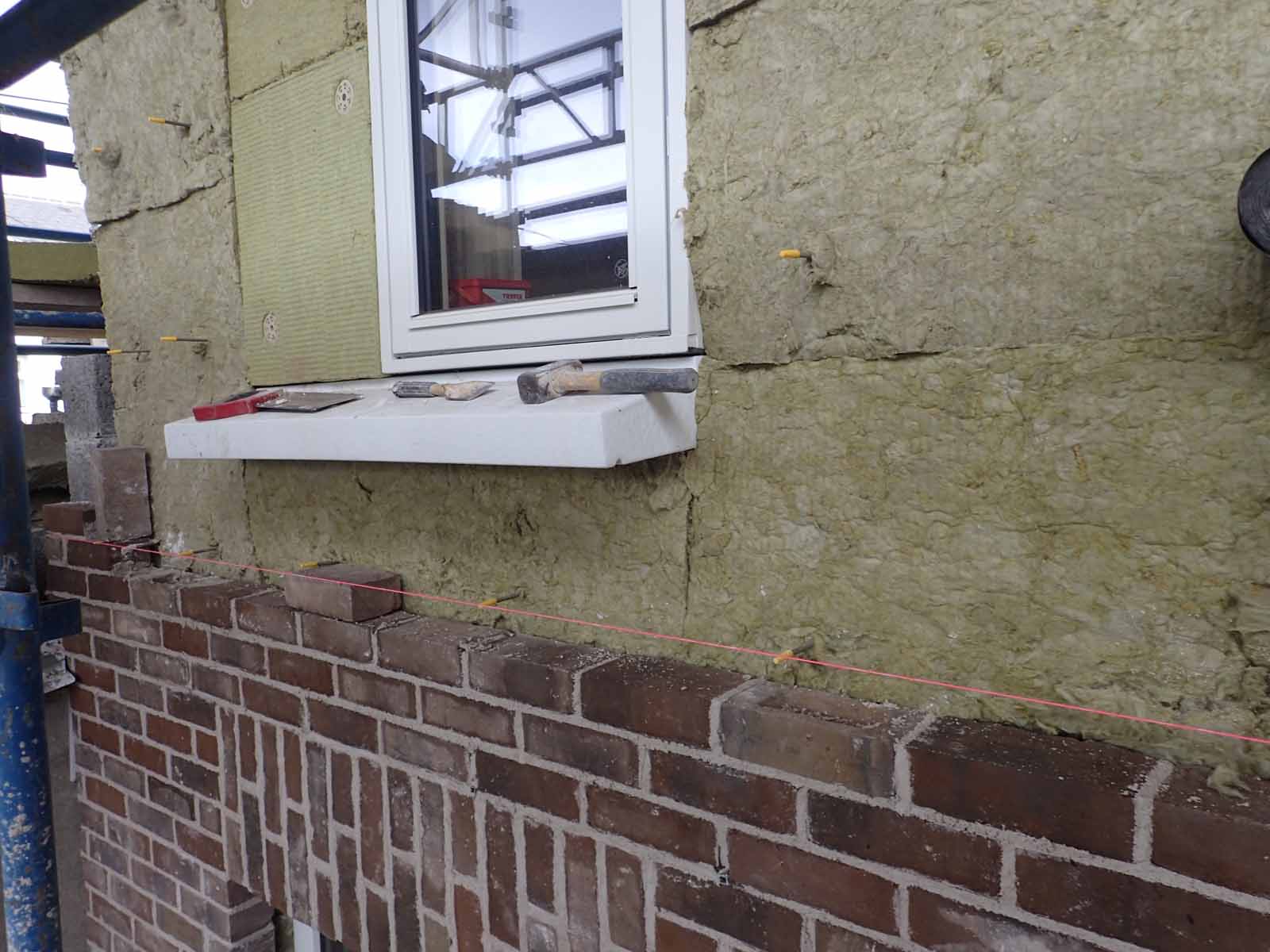 Rear brick cavity wall with basalt wall ties and window fully enclosed in 250 mm rockwool insulation on EPS sill