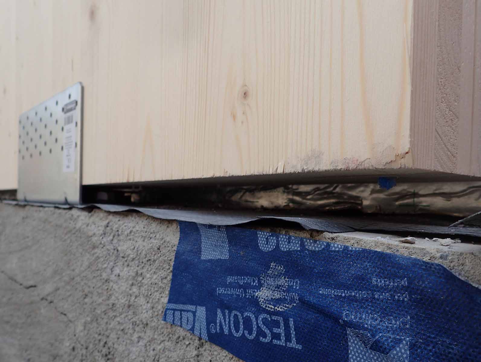 Detailed view of completely level CLT wall panel separated from rising wall by packers prior to side fixing of screws in plate