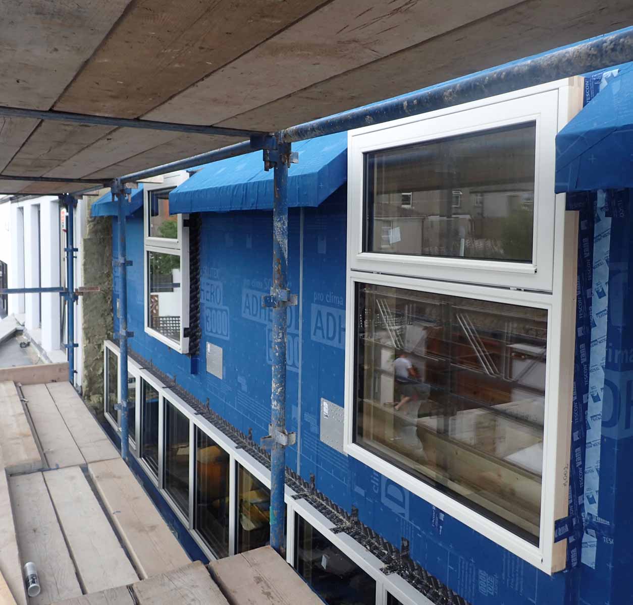 View of windows to front mounted forward of CLT in external insulation zone on Bosig structural board below