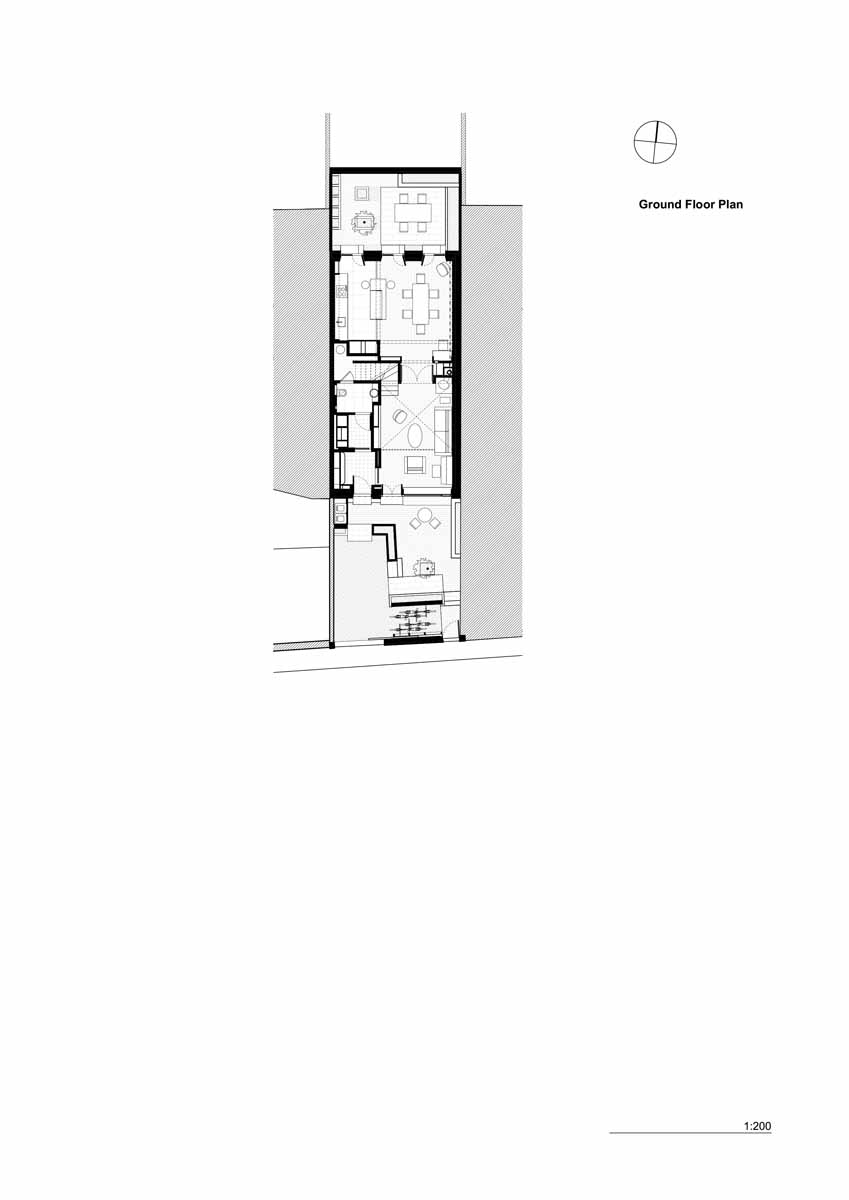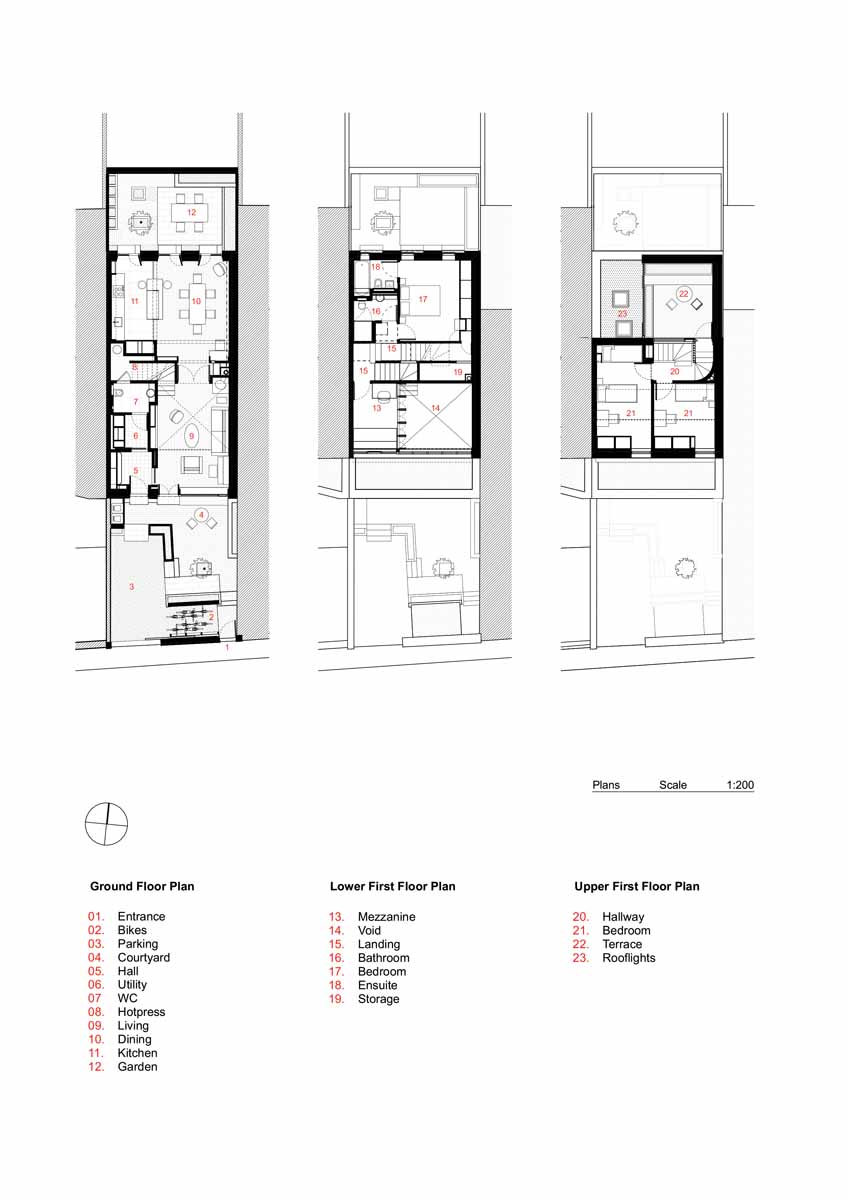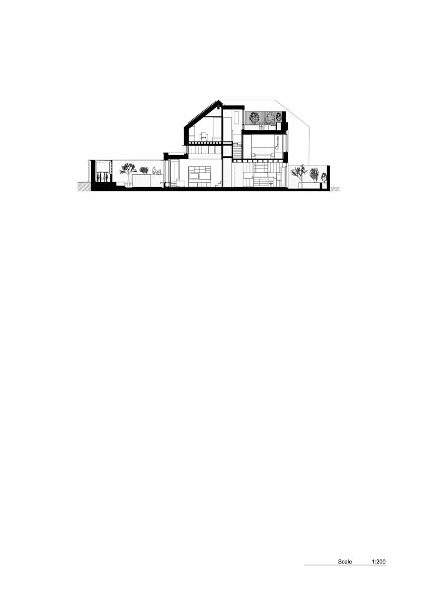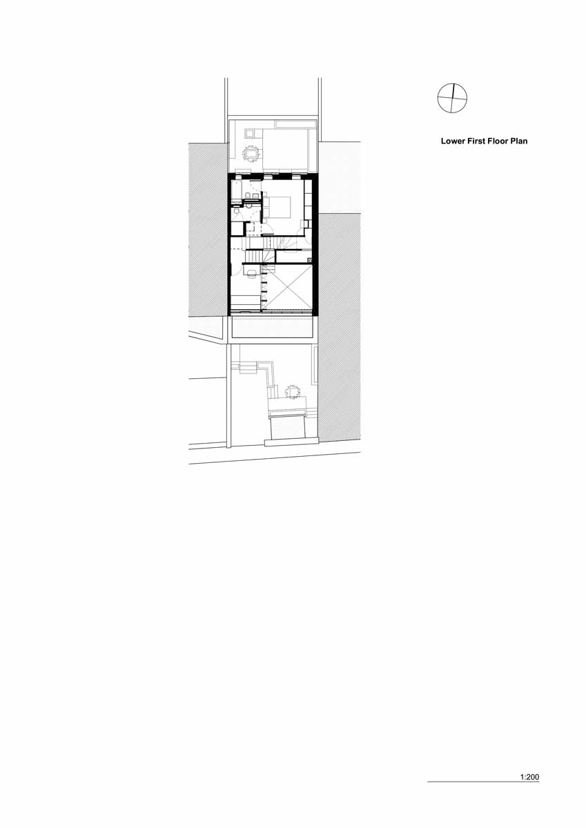 The first hint of difference that marks this 135 sqm dwelling from its terrace neighbours is the row of clerestory windows positioned directly above the shallow single-storey flatroofed extension at the front, which beams in sunlight into a south-facing double-height front room. A central stair connects four storeys with varying ceiling heights, rising first to a mezzanine at the front, through two levels of bedrooms and ending in the roof terrace to the rear.