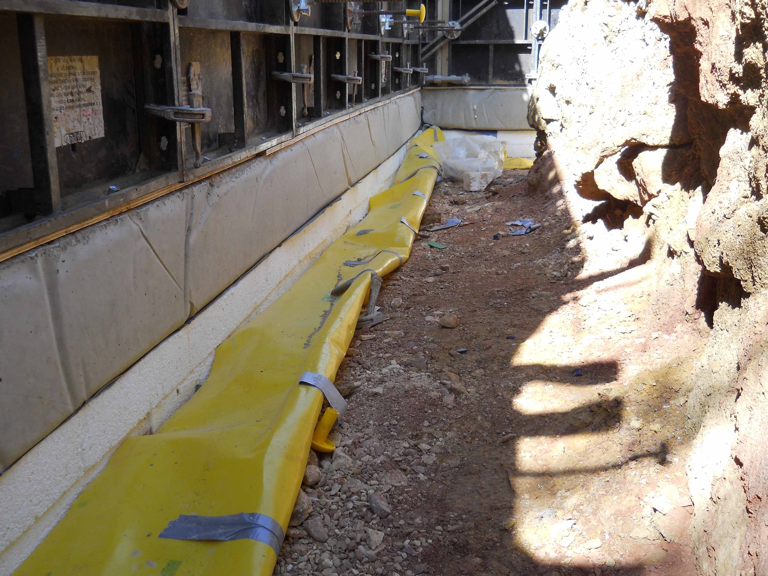 The retaining walls are tanked with Visqueen self-adhesive tanking membrane, insulated externally with 100mm of expanded polystyrene, and protected with Visqueen Protect and Drain membrane.
