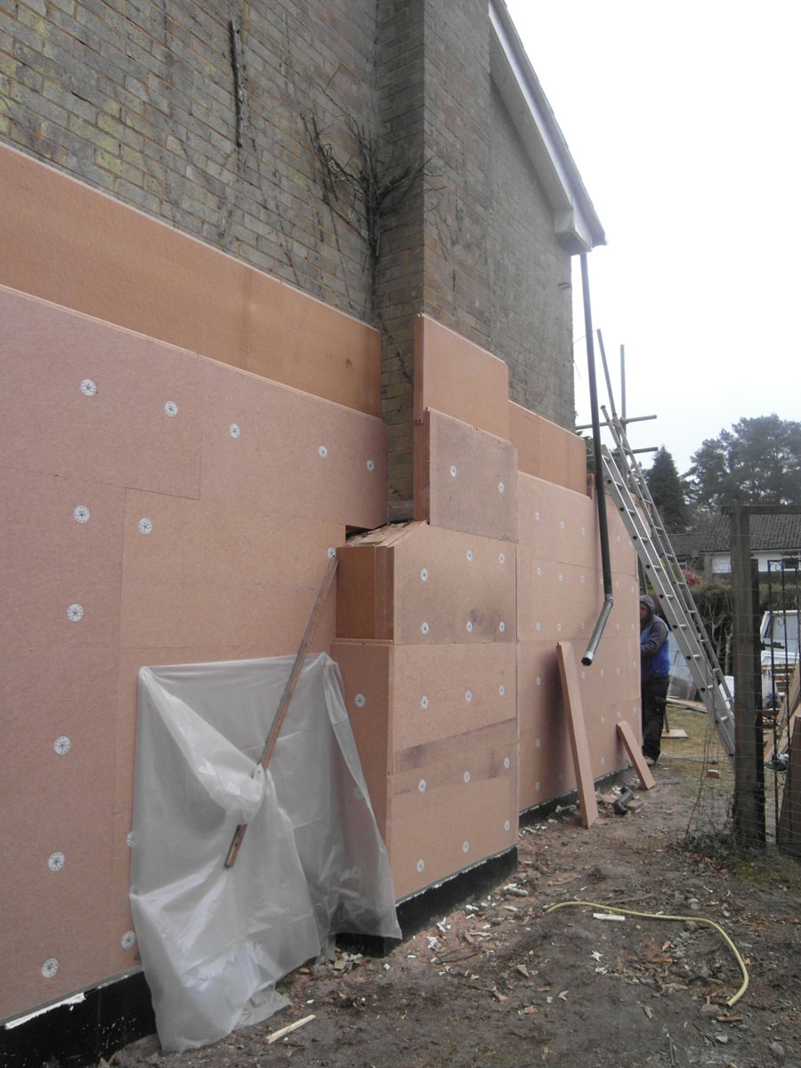 Front and rear walls, tile hanging removed revealing in-situ cast concrete boot lintols which would be costly to remove. Walls upgraded with 100mm Steico Protect wood fibre boards under timber painted weatherboarding. U-value: 0.249 W/m2K.