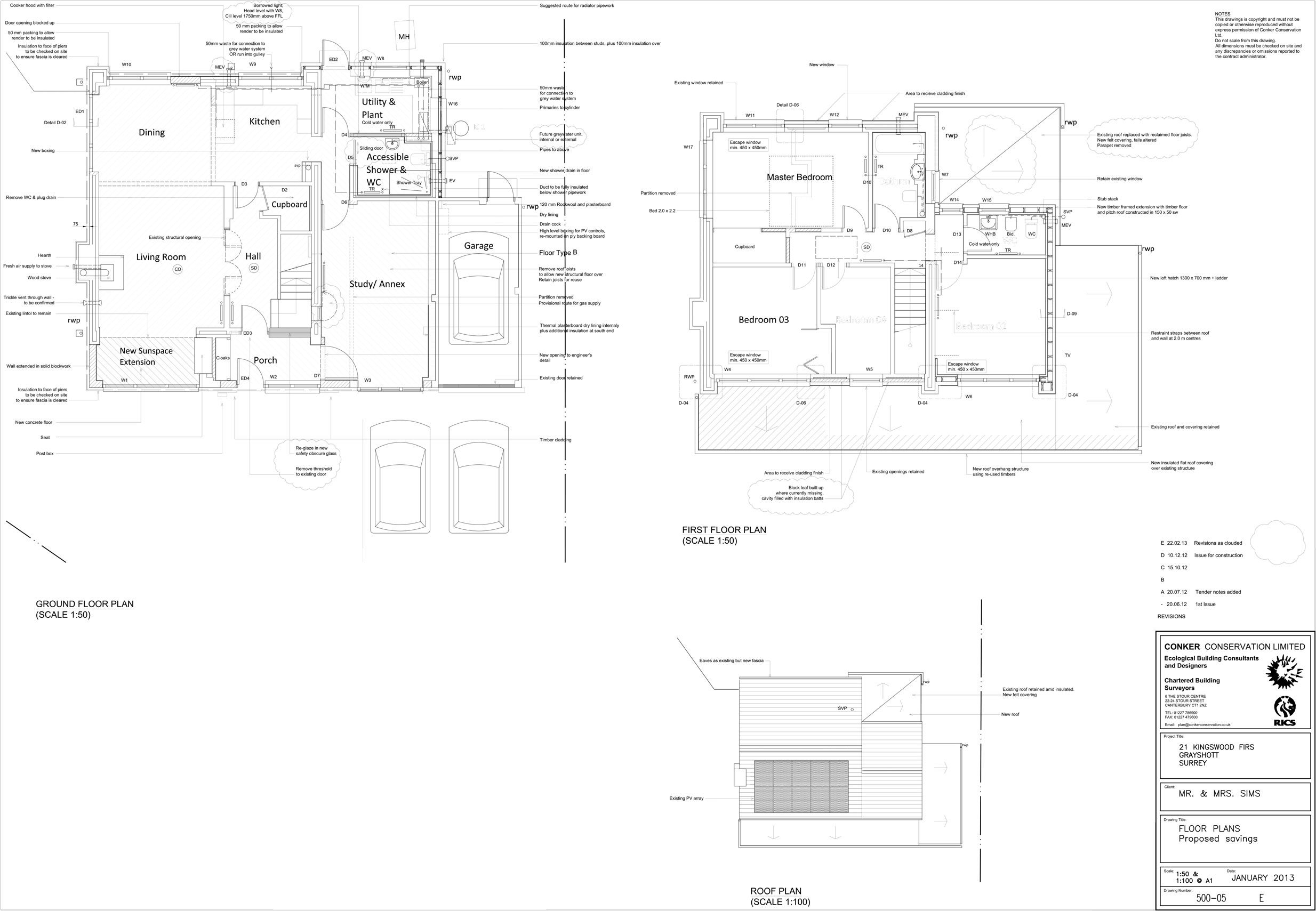 Thermal bridges (such as the cast concrete lintels that spanned the cavity walls front and back) were mostly dealt with by using the external insulation, but many complex junctions were involved in the conversion of the garage and abutment of flat roofs, requiring careful positioning of both internal and external insulation.