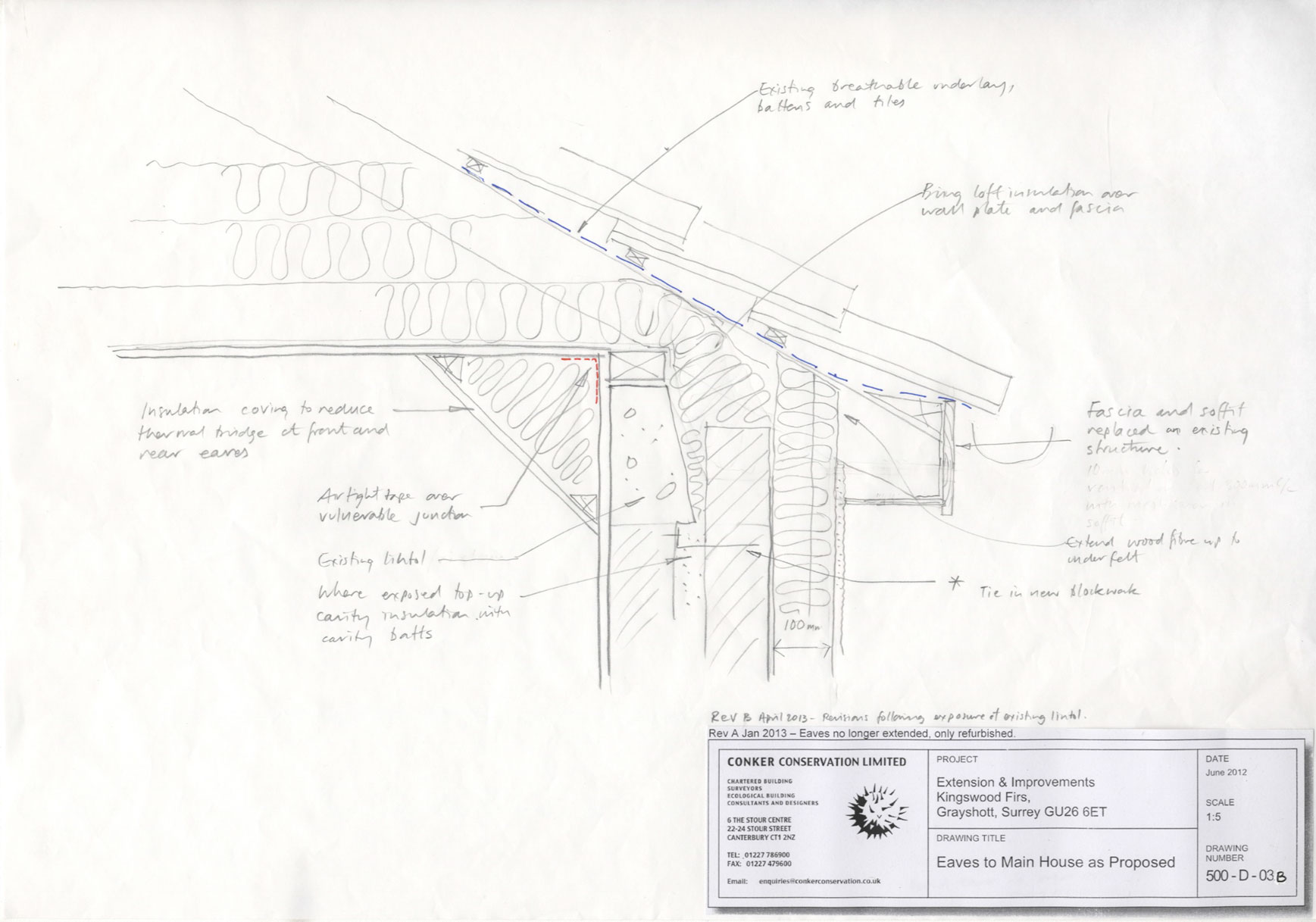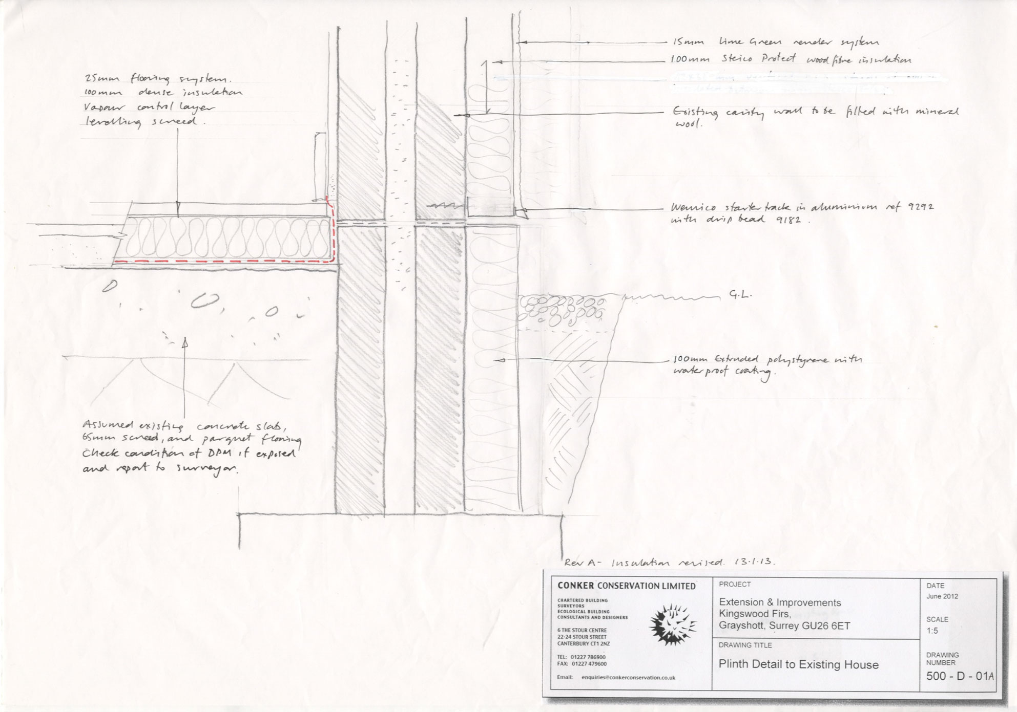Walls below DPC level insulated with 100mm extruded polystyrene and painted with bitumen, to reduce cold bridge at floor perimeter and compensate for relatively poor floor U-values. At eaves junction internally an insulated cornice formed to reduce thermal bridge.